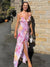 - Cette robe a un design à imprimé floral élégant, des couleurs vives et des vibrants. L'ajustement slim de la jupe met en évidence la beauté tout en courbes des femmes. Les sangles minces et le design à col en V profond ajoutent un sentiment de sex-appeal et de style, tout en embellissant le décolleté. L'ourlet de la jupe adopte un design à fente haute, montrant les lignes de jambes en marchant, en augmentant la dynamique et le charme. Dans l'ensemble, cette robe convient à diverses occasions formelles ou semi-formelles, telles que des dîners, des fêtes ou des mariages.