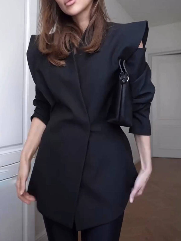 - Cette veste présente un design minimaliste, avec des découpes aux épaules et une fente au niveau de la poitrine ajoutant une touche distinctive. Le tissu en polyester garantit confort et durabilité, tandis que les détails des poches et des boutons améliorent la praticité. Idéale pour les saisons automne-hiver, elle peut être portée comme tenue formelle pour le bureau ou pour des occasions quotidiennes décontractées, mettant en valeur l'élégance et le style rétro.