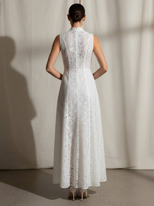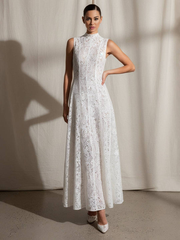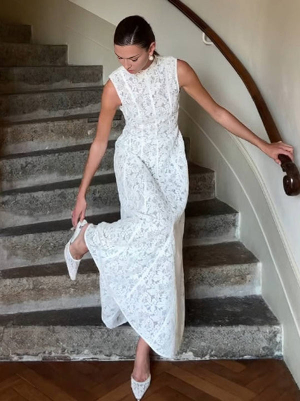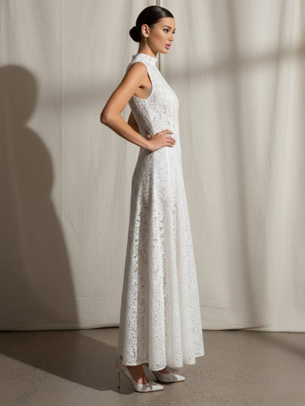 - Cette robe présente un design de dentelle fine et élégante, un style sans manches à col haut qui dégage une élégance féminine. La coupe longue associée à un style minimaliste la rend idéale pour les invités de mariage, les bals et les anniversaires. Le tissu léger et respirant assure une expérience de port confortable. Une combinaison d'éléments rétro et modernes souligne son charme unique. Que ce soit au printemps, en été ou en automne, elle peut être le centre d'attention. L'artisanat dans les détails améliore encore l'apparence globale.