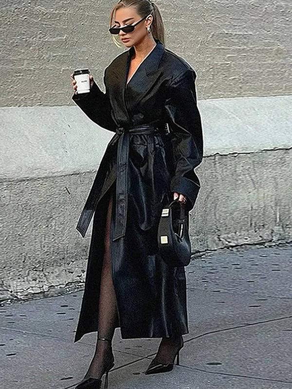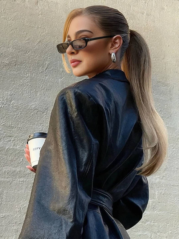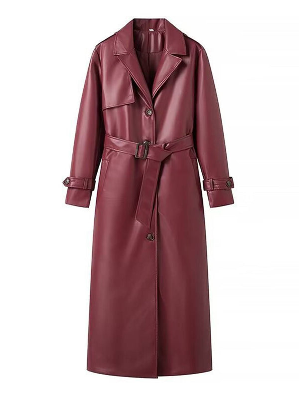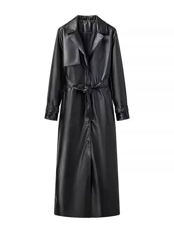 - Cette veste longue est fabriquée en cuir synthétique, avec un design simple mais distinctif. Les détails du boutonnage simple et du col rabattu ajoutent une touche rétro, tandis que la ceinture souligne une silhouette élégante. Les poches sont à la fois pratiques et stylées. Idéale pour les tenues quotidiennes ou les occasions formelles pendant l'automne et l'hiver, elle combine mode et élégance classique. Que ce soit avec des talons hauts ou des pantalons décontractés, elle s'adapte facilement à différents styles.