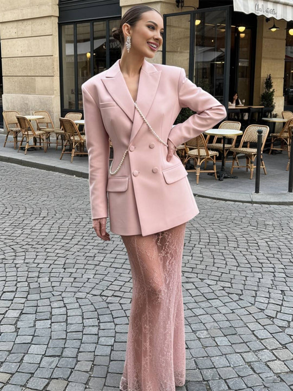 - Cette jupe longue présente un design en dentelle exquise, associée à une veste de tailleur à double boutonnage, mettant en valeur l'élégance et la confiance des femmes. Les ornements en chaîne de perles ajoutent une touche de luxe, la rendant idéale pour les occasions formelles ou les dîners. Le tissu est doux et confortable, avec une coupe ajustée qui souligne parfaitement les courbes du corps. Un traitement minutieux des détails souligne la qualité haut de gamme. Que ce soit lors d'une réunion d'affaires ou d'une soirée sociale, vous serez au centre de l'attention.