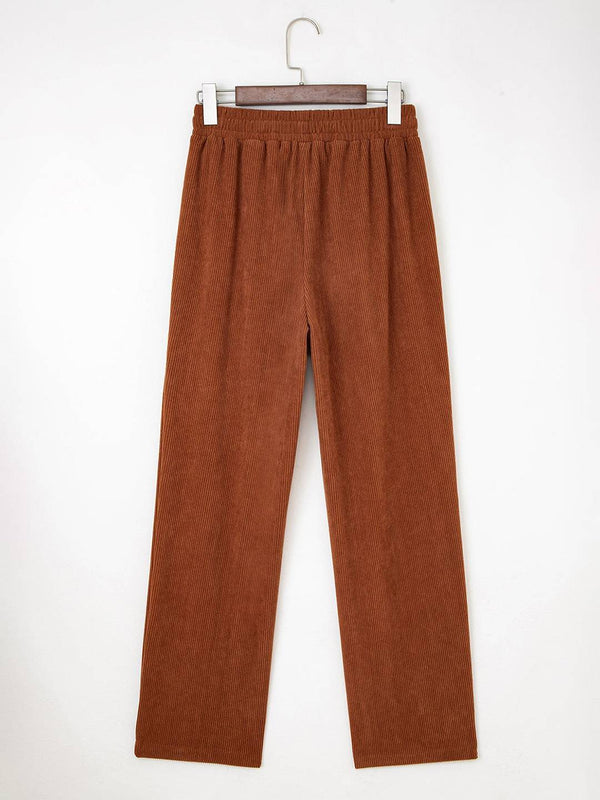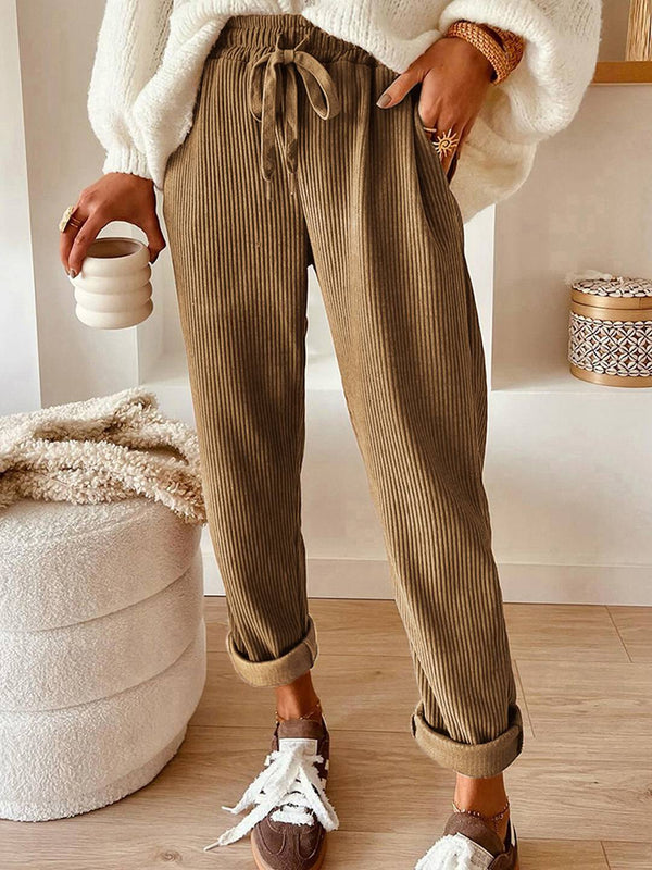 - Ce pantalon en forme de carotte est fabriqué en tissu de polyester, doux et confortable, avec une bonne respirabilité et résistance à l'usure. Le pantalon est équipé d'une ceinture à cordon ajustable pour un ajustement confortable. Des poches pratiques sur les côtés facilitent le transport d'objets petits au quotidien. Les ourlets légèrement resserrés affinent non seulement les lignes des jambes mais ajoutent également une touche de décontraction. Que ce soit à la maison ou à l'extérieur, ce pantalon peut facilement s'associer à divers hauts, montrant un style simple mais élégant.