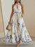 - Le design de cette robe est plein d'élégance et de mode. Premièrement, la moitié supérieure a un design sans manches qui expose les épaules et la clavicule, montrant les lignes douces des femmes. La conception en forme de V à l'encolure augmente non seulement la superposition visuelle, mais modifie également l'encolure et rend la forme globale plus mince. La conception de la ceinture bleue à la taille a non seulement l'effet de la taille de la taille, mais ajoute également une couleur vive à l'ensemble, brisant le ton blanc monotone, ce qui rend la robe entière plus vive. La conception de jupe plissée dans la moitié inférieure est un point culminant de cette robe. La conception de la jupe plissée augmente non seulement la trois dimensionnalité de la jupe, mais fait également l'ourlet de la jupe flottant dans le vent lors de la marche, en ajoutant dynamique et vitalité. Les motifs floraux sur la jupe sont en bleu, orange et autres couleurs, qui contrastent avec l'arrière-plan blanc. Ils sont à la fois frais et naturels et sont pleins de sens artistique. Cette robe convient à porter à une variété d'occasions, que ce soit un mariage, un dîner ou un rendez-vous quotidien, et il peut montrer l'élégance et le charme d'une femme.